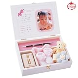 天使のキセキを残せます。 手形足形を取る用紙が3枚入っていて、その中から一番よい物を選んで送ります。でも生まれたての赤ちゃんの手足を持って紙にペタッと押し付けるのは中々大変で、自分で文字も記入するのですがバランスが悪かったりと自分では選べませんでした。そのことを伝えると先方で一番よい物を選んで加工していただけたのでとてもきれいに仕上がって戻ってきました。これはよくあるインクで残す物ではなくて取った型の上にゴールドで盛り上がった特殊加工がしてあります。色落ちする物でもなさそうなので飾っていても豪華に見えます。お値段は少々高めですが、とても満足しています。